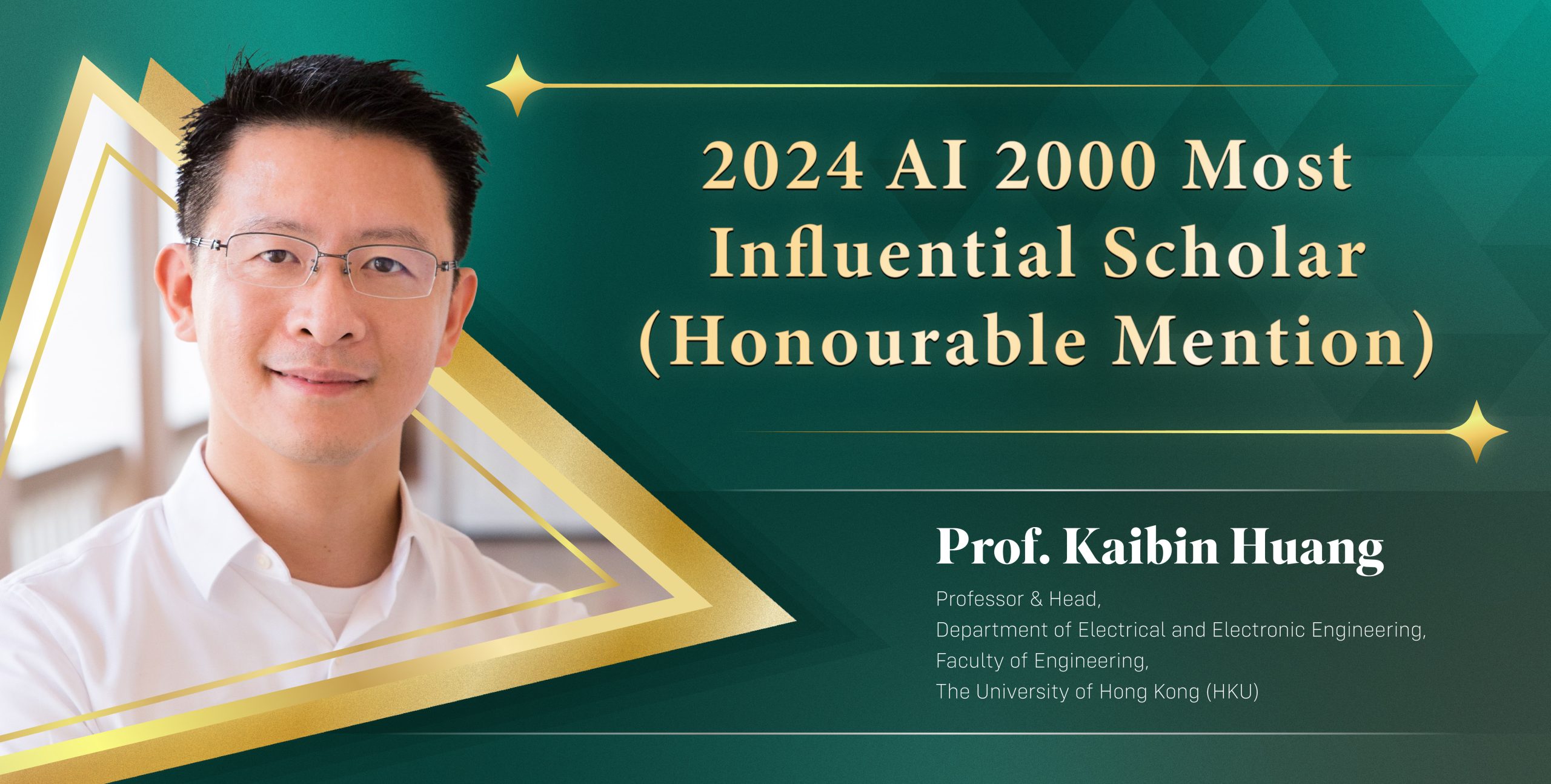 Congratulations to Prof. Kaibin Huang from the Department of Electrical and Electronic Engineering, the Faculty of Engineering of the University of Hong Kong (HKU) for his outstanding achievements that garnered international recognition as the 2024 AI 2000 Most Influential Scholar (Honourable Mention) for their exceptional contributions to artificial intelligence between 2014 and 2023.
