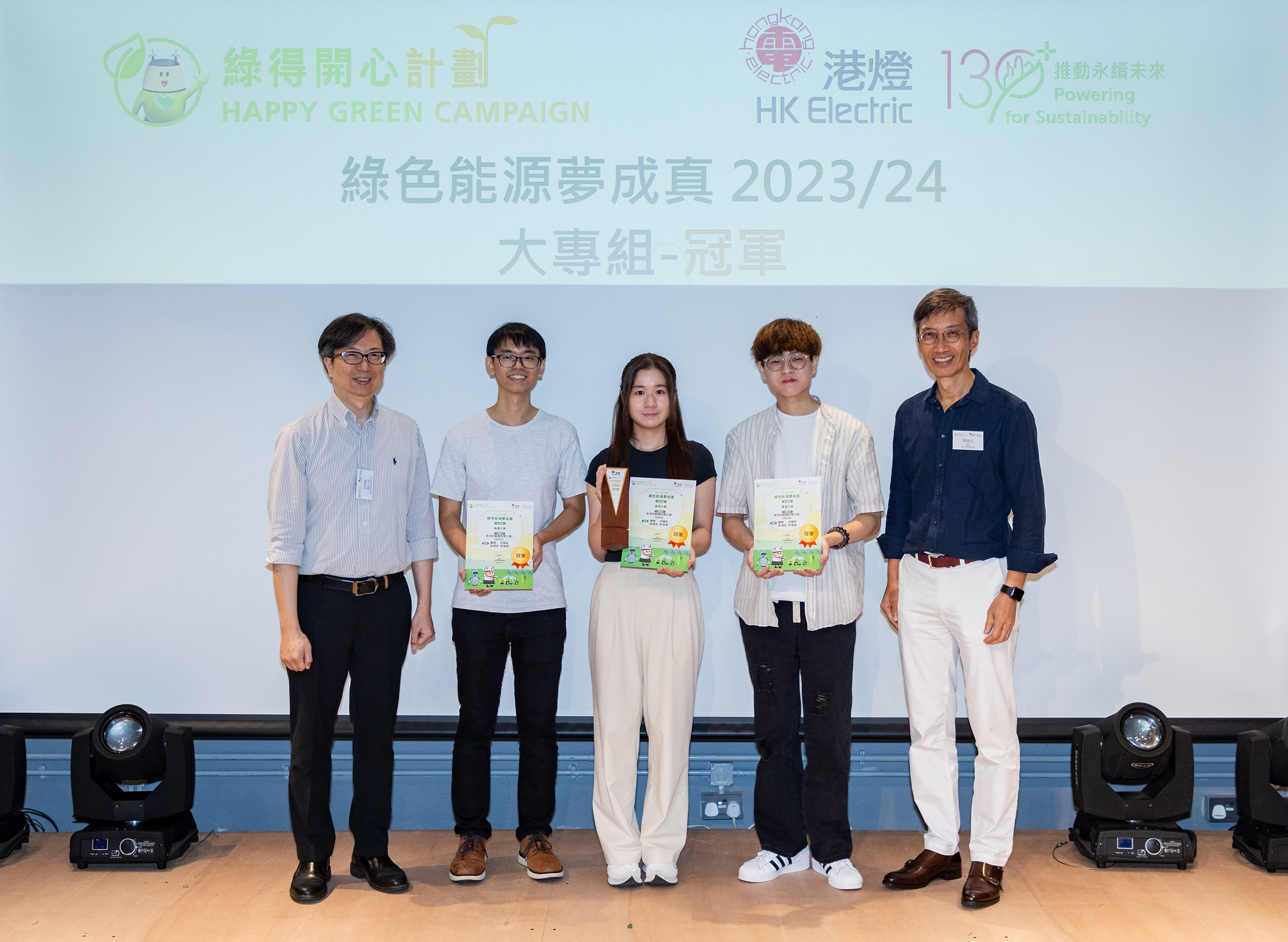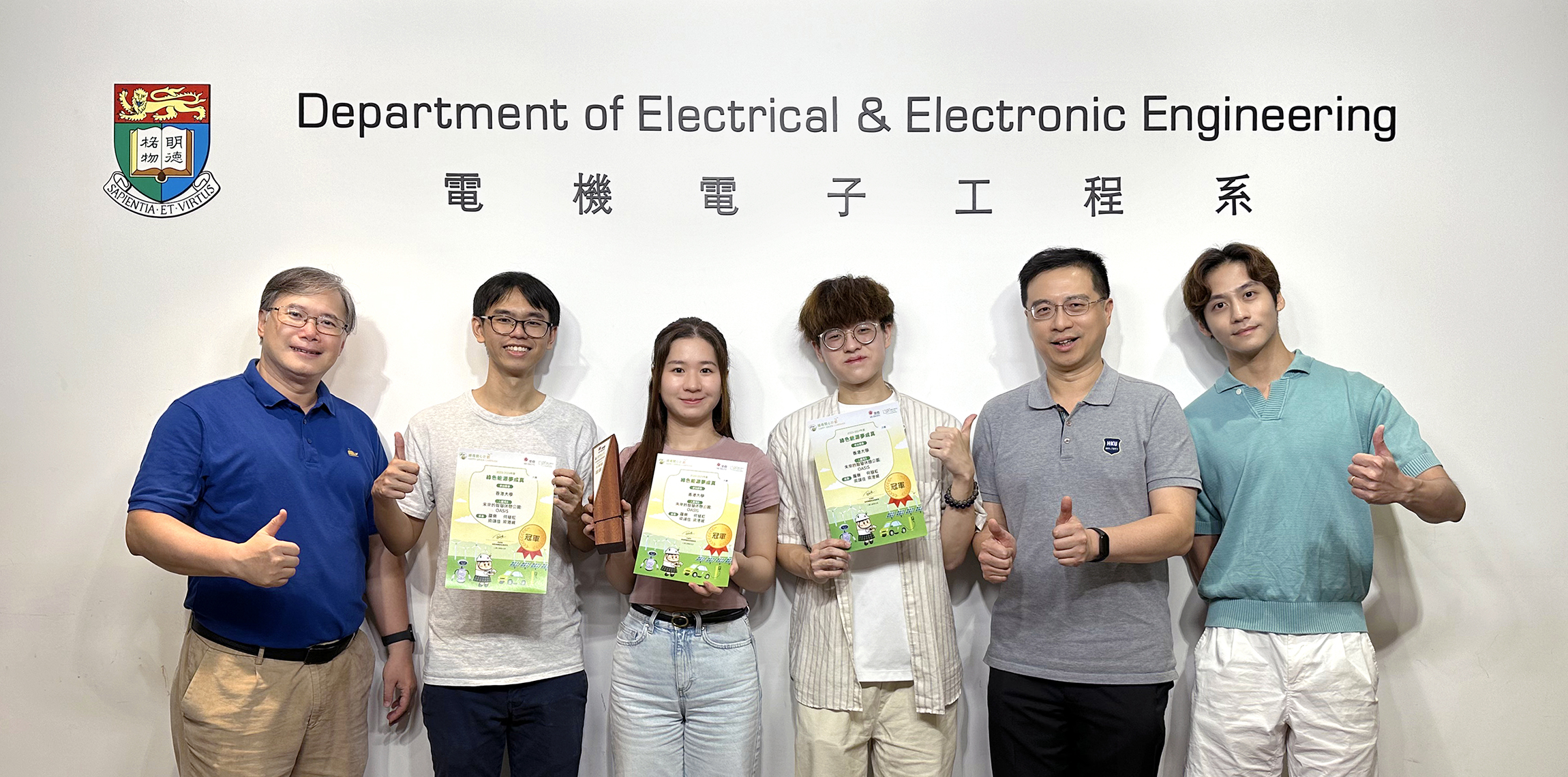 Congratulations to Mr. Lo Lok, Miss He Wai Hung (Fiona), and Mr. Leung Chung Kai (John), ELEC3848 students in the Department of Electrical and Electronic Engineering at The University of Hong Kong, for winning the Champion Award in the Green Energy Dreams Come True Competition 2023/24 (Tertiary) organised by the Hong Kong Electric Company Limited.