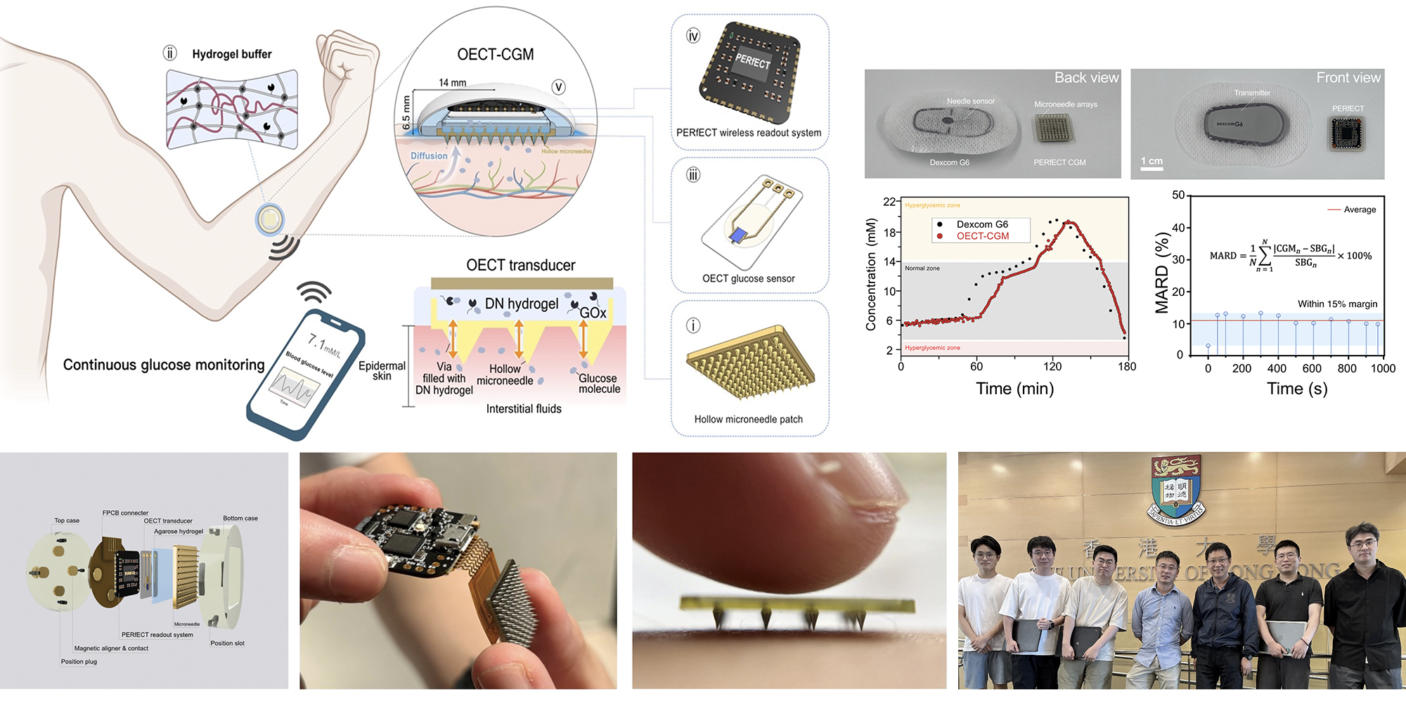 Led by Professor Shiming Zhang of the Department of Electrical and Electronic Engineering at HKU, the new CGM system, termed OECT-CGM, features a compact, coin-sized design integrating state-of-the-art biosensors, minimally invasive tools, and hydrogels. The core part of the device is the organic electrochemical transistor (OECT), a biochemical signal amplifier that significantly improves the signal-to-noise ratio (SNR) beyond traditional electrochemical sensors. This advancement is critical for providing accurate and reliable glucose readings essential for effective diabetes management.