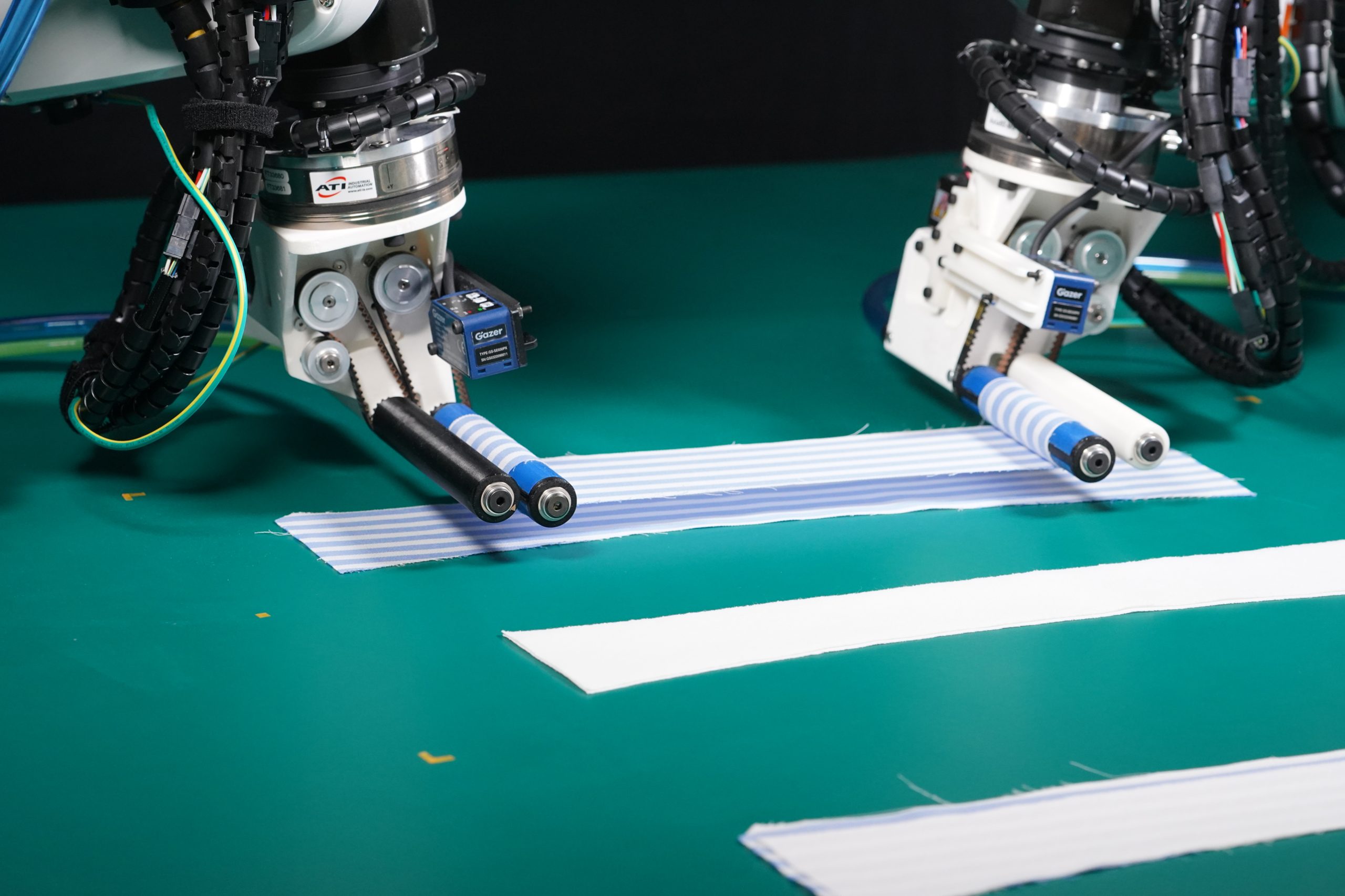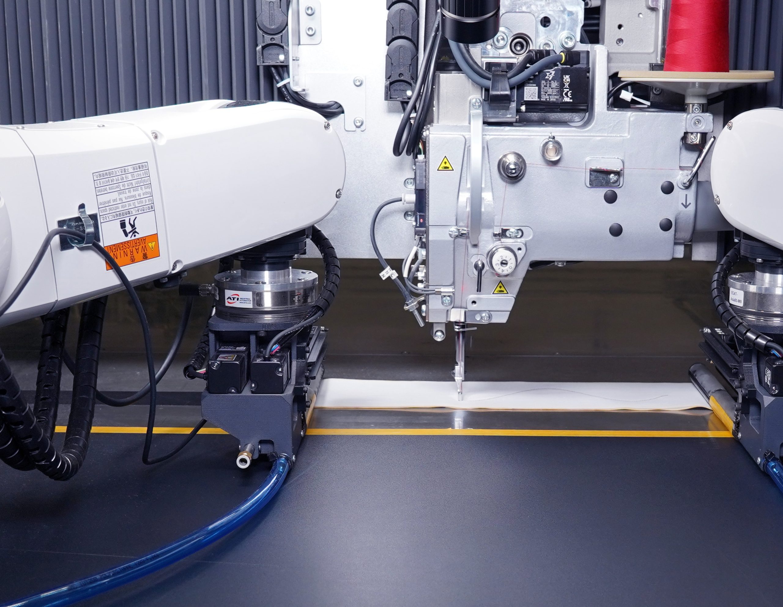 The invention is an automated robotic sewing system addressing manual labor shortages and the need for custom fixtures for sewing operation. It features dual manipulators with force/torque sensors, a vision module for seam line tracking, and wrinkle removal. The system performs precise fabric manipulation and sewing along both visible and virtual sewing lines without fixtures, enhancing efficiency and adaptability in garment manufacturing.