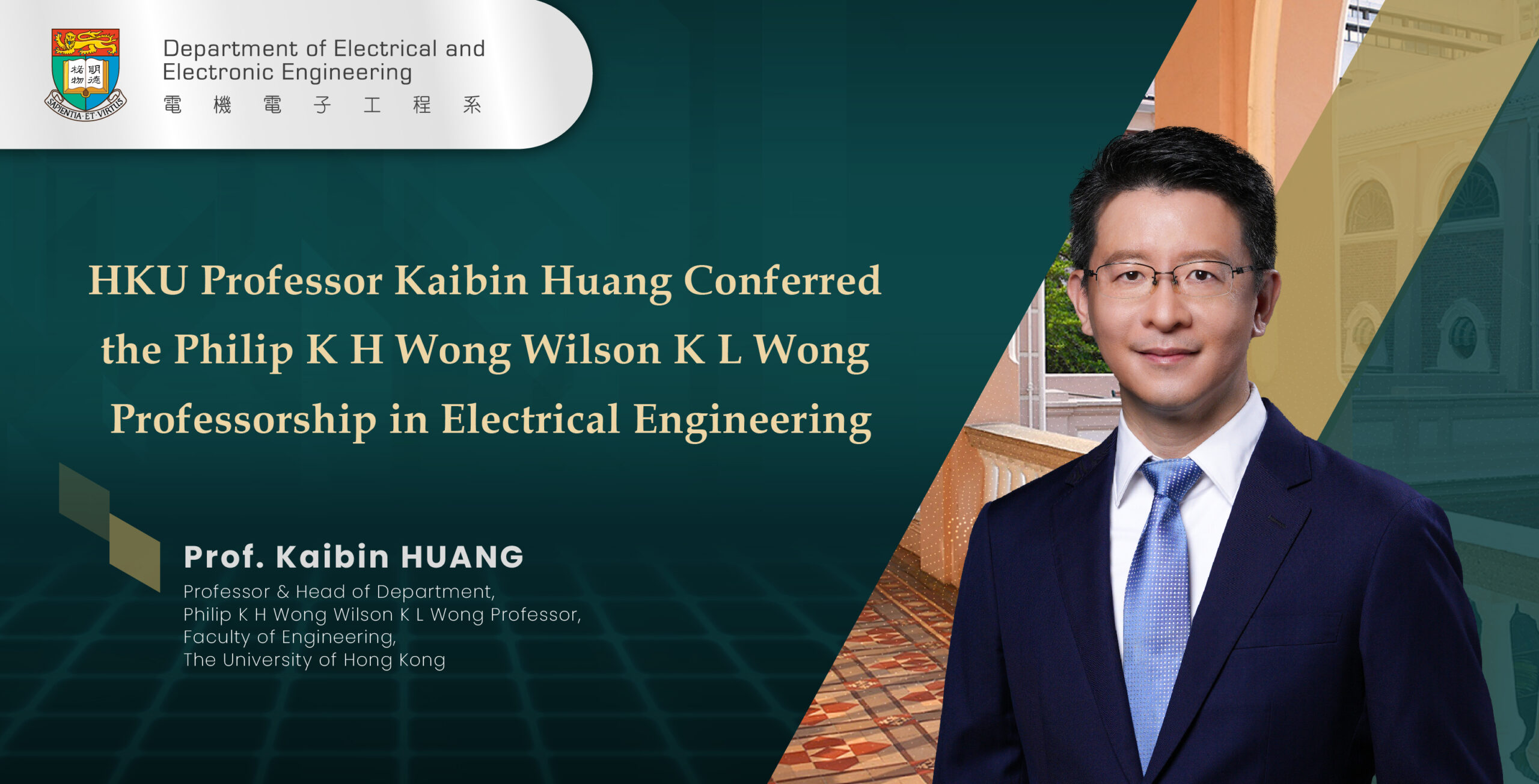 Congratulations to Professor Kaibin Huang, Head and Professor of the Department of Electrical and Electronic Engineering (EEE), The University of Hong Kong (HKU), who has been conferred the Philip K H Wong Wilson K L Wong Professorship in Electrical Engineering by The University of Hong Kong.