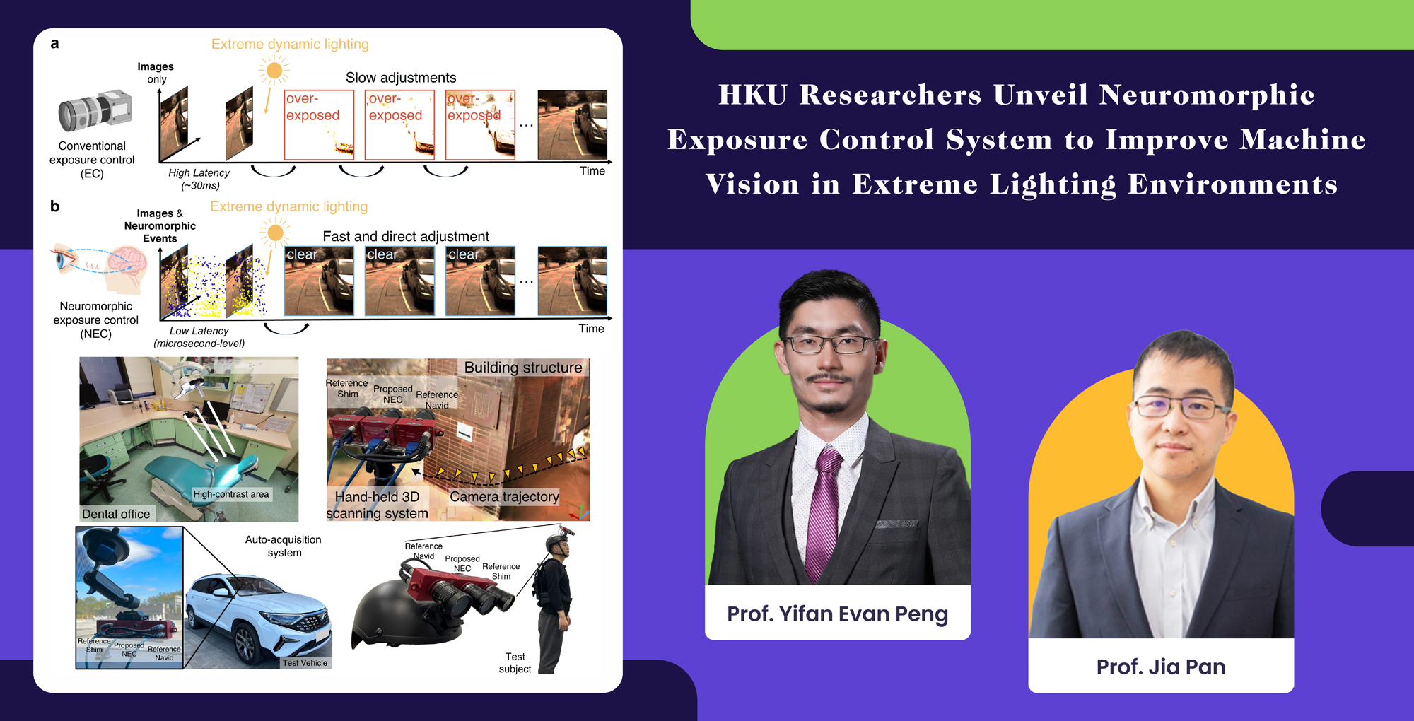 A research team led by Professor Jia Pan and Professor Yifan Evan Peng from the Department of Computer Science and Department of Electrical & Electronic Engineering under the Faculty of Engineering at the University of Hong Kong (HKU), in collaboration with the researcher at Australian National University, has recently developed a groundbreaking neuromorphic exposure control (NEC) system that revolutionizes machine vision under extreme lighting variations. Published in Nature Communications, this biologically inspired system mimics human peripheral vision to achieve unprecedented speed and robustness in dynamic perception environments.