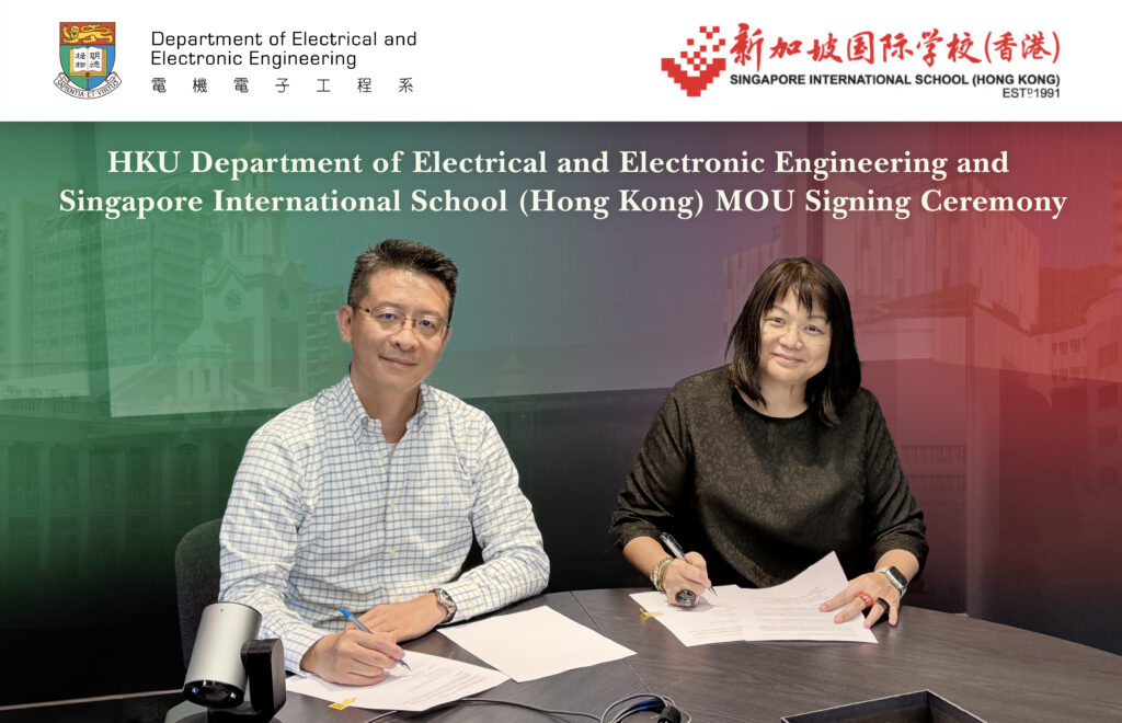 On June 5, 2025, the Department of Electrical and Electronic Engineering at The University of Hong Kong (HKU-EEE) signed a Memorandum of Understanding (MoU) with the Singapore International School (Hong Kong) (SISHK), marking the beginning of an internship scheme that will bring Diploma Programme (DP) students from SISHK to the Department to participate in research projects and experiential learning during the summer holidays, as part of our ongoing efforts towards providing exposure to the Research and Development (R&D) environments for the high school community.