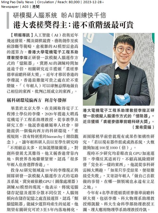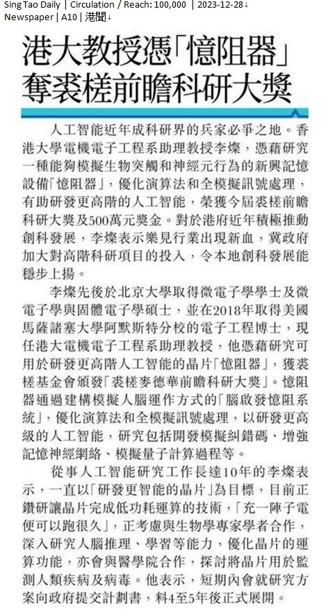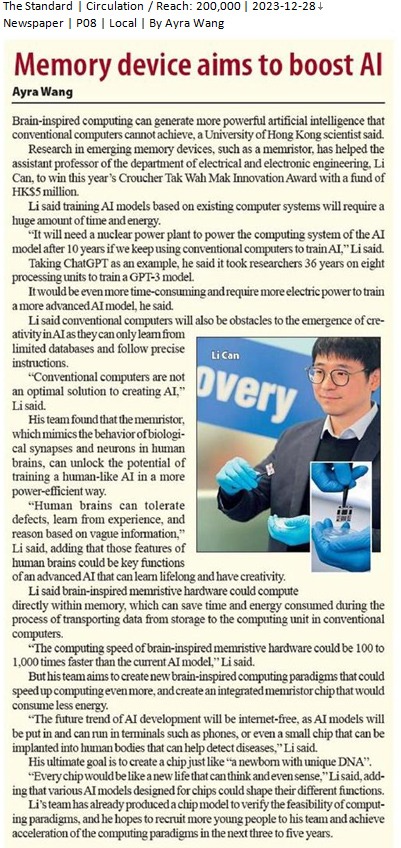 Dr Li said that training AI models based on existing computer systems would require a huge amount of time and energy. Taking ChatGPT as an example, he mentioned that the model takes 36 years to train using eight state-of-the-art graphic processing units for a GPT-3 model, and even longer for the latest GPT-4 model. His team found that the memristor, which mimics the behavior of biological synapses and neurons in human brains like tolerating defects, learning from experience, and reasoning based on vague information, can unlock the potential of training a human-like AI in a more power-efficient way. The computing speed of brain-inspired memristive hardware could be 100 to 1,000 times faster than the current AI model. Li’s team has already produced a chip model to verify the feasibility of computing paradigms. His team aims to create new brain-inspired computing paradigms that could speed up computing even more, and create an integrated memristor chip that would consume less energy and his ultimate goal is to create a chip just like “a newborn with unique DNA” that can think and even sense.