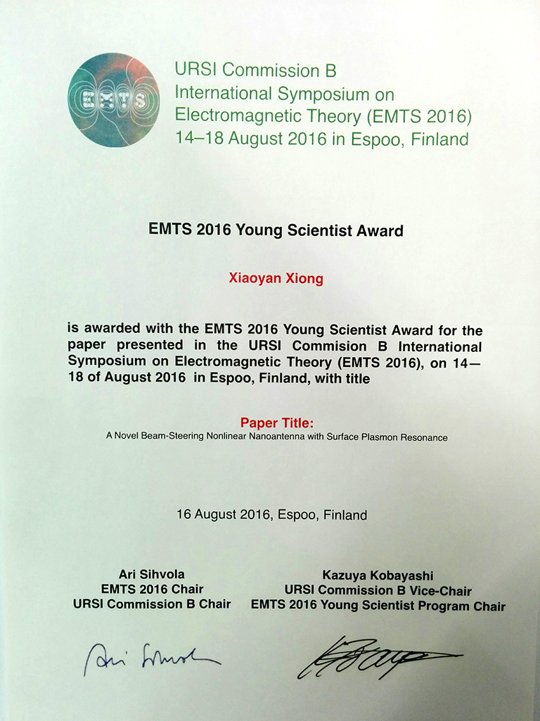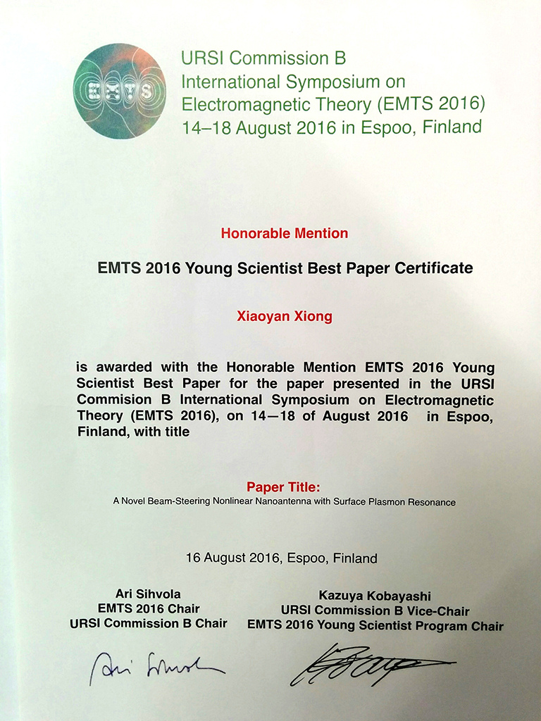 Dr. L. Jiang’s former Ph.D student and current Postdoc Dr. Xiaoyan Xiong received two awards at URSI Commission B International Symposium on Electromagnetic Theory (EMTS 2016) in Espoo, Finland on Aug. 18th: