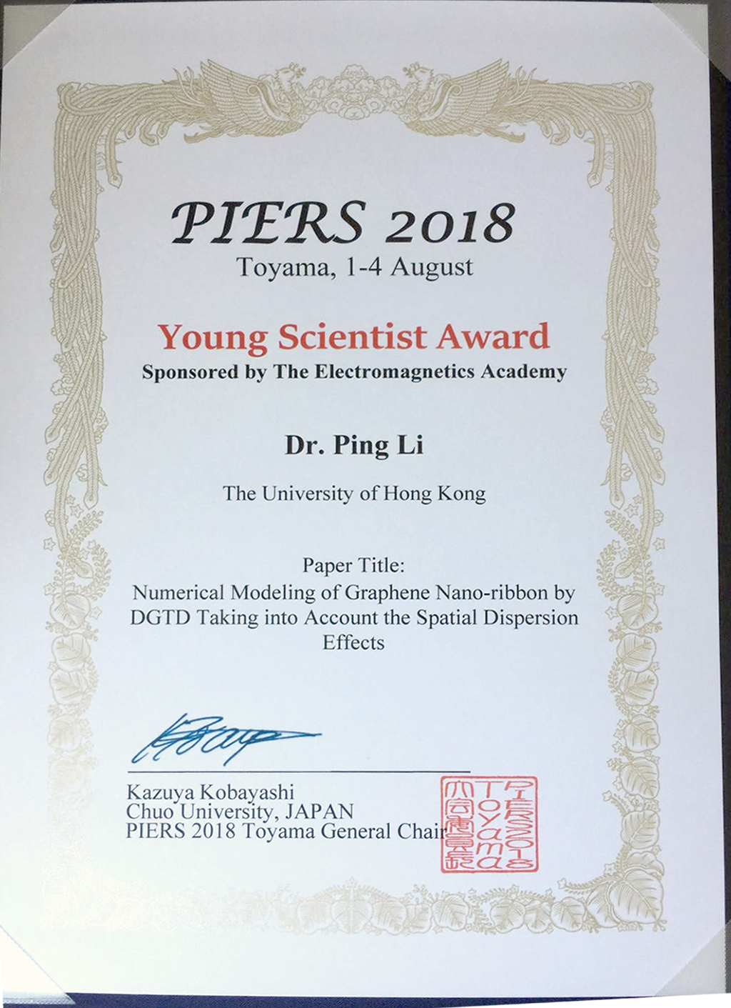 Besides Menglin Chen, Dr. L. Jiang former RPG student, current Research Assistant Professor (RAP), Dr. Ping Li just received the Young Scientist Award at PIERS 2018. His paper is “Numerical Modeling of Graphene Nano-ribbon by DGTD Taking into Account the Spatial Dispersion Effects,” coauthored by Ping Li, Lijun Jiang, and Hakan Bagci. This is the 3rd international Young Scientist Award that Dr. Li has received in 2018.