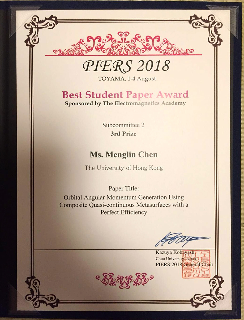 Dr. L. Jiang’s student Menglin Chen received the PIERS 2018 Best Student Paper Award 3rd Prize at Toyama, Japan last week. The awarded paper is “Orbital Angular Momentum Generation Using Composite Quasi-continuous Metasurfaces with a Perfect Efficiency,” coauthored by Menglin Chen and Lijun Jiang.