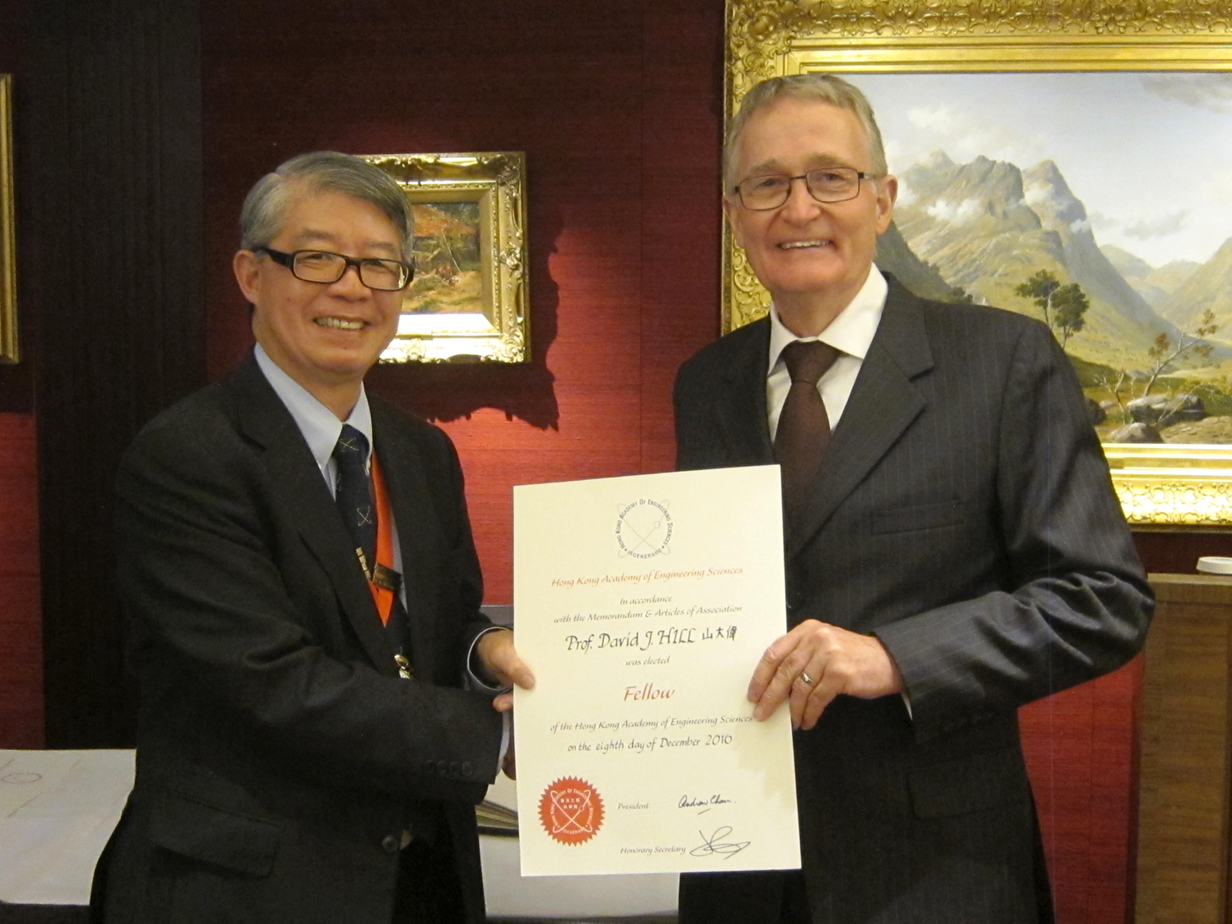 Prof. D. Hill has selected as one of the New Fellows of the Hong Kong Academy of Engineering Sciences (HKAES) for 2016. The welcome dinner for New Fellows was held in the Hong Kong Club on 16th January 2017. Prof. Hill is also a member of The Australian Academy of Science and the Australian Academy of Technological Sciences and Engineering and a Foreign Member of the Royal Swedish Academy of Engineering Sciences.
