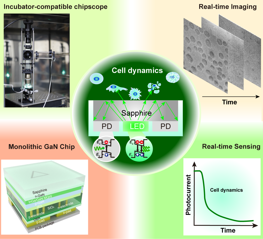 An Interdisciplinary collaboration led by Dr. Zhiqin Chu (Electrical and Electronic Engineering, HKU), Dr. Kwai Hei Li (School of Microelectronics, SUST), and Dr. Yuan Lin (Mechanical Engineering, HKU) established a GaN chipscope to quantitatively monitor the progression of different intracellular processes in a label-free manner. This GaN-based monolithic chip enables not only a photoelectric readout of cellular/subcellular refractive index changes but also the direct imaging of cellular/subcellular ultrastructural features using a customized differential interference contrast (DIC) microscope. Especially, this chipscope is highly miniaturized that allows to be readily mounted with conventional cell culture dished and placed inside standard cell incubator for real-time monitoring. This practical device would provide new insight into the fundamental research of cell biology and drug discovery and assist the development new generation of biosensors.