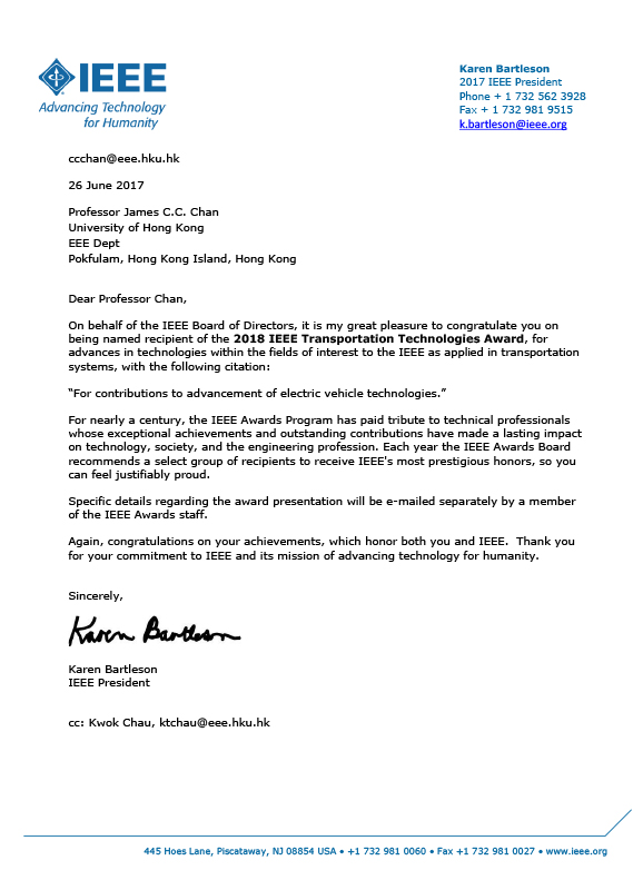 Prof. C.C. Chan has been awarded the IEEE 2018 Transportation Technologies Award.