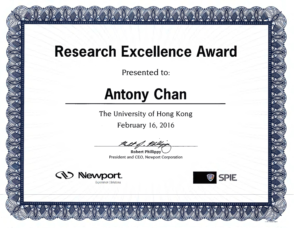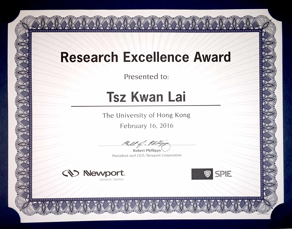 Two RPG students, Mr. Antony Chan (Supervisor: Prof. Edmund Lam) and Miss Queenie Lai (Supervisor: Dr. Kevin Tsia), received Newport Research Excellence Awards in the SPIE Photonics West conference, held in San Francisco, United State, in February 2016.