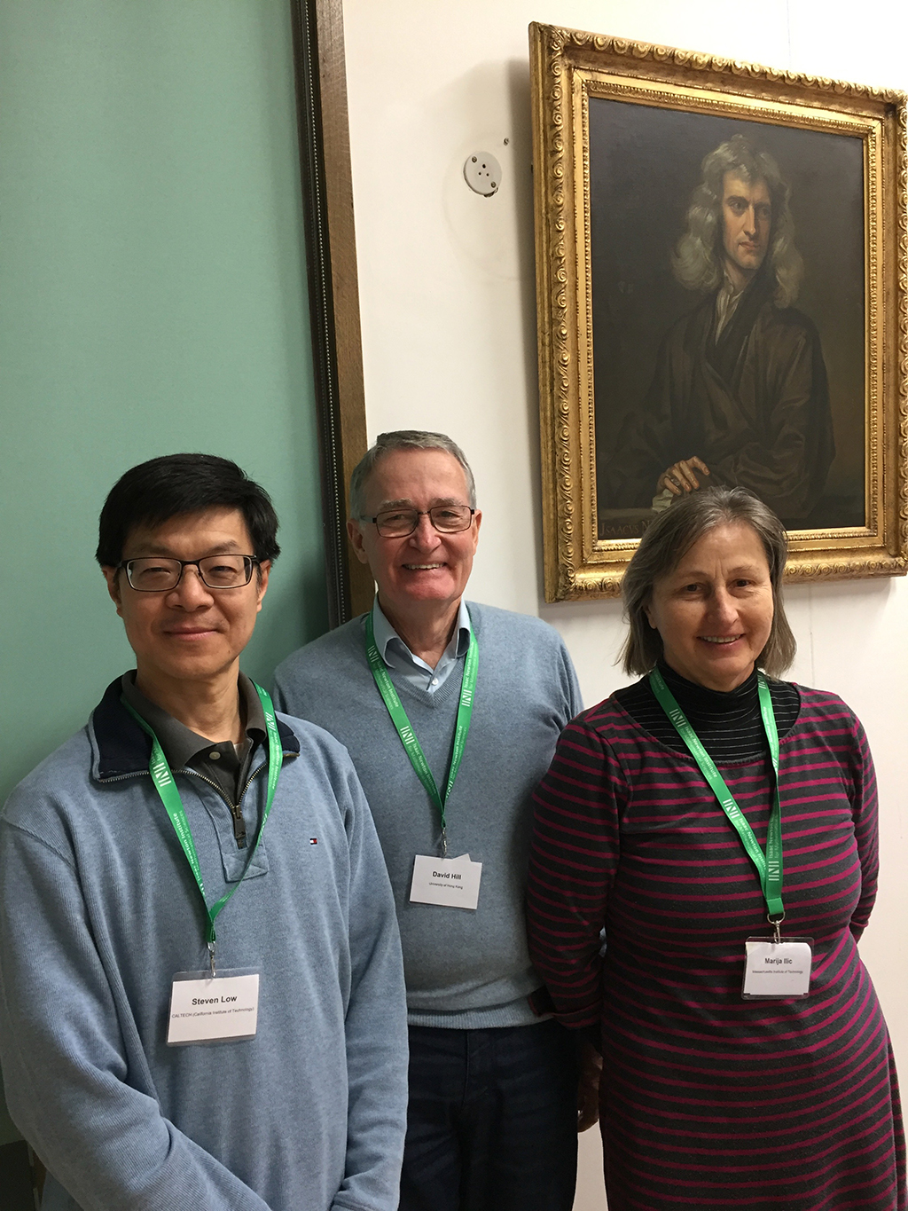 The photos show the closing workshop group photo and Professor Hill with Stephen Low (Caltech), Marija Ilic (MIT) and Sir Isaac Newton (painting).