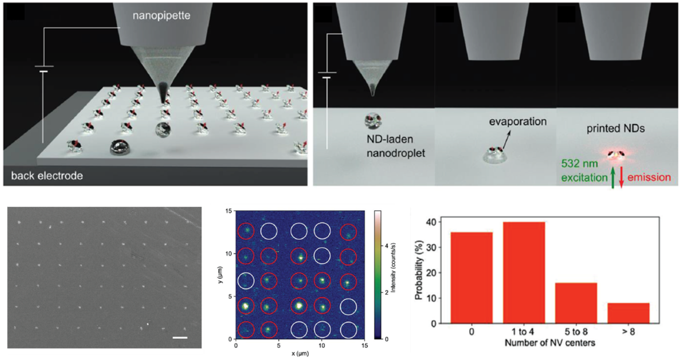 Collaborative research led by Dr. Ji Tae Kim (Mechanical Engineering) and by Dr. Zhiqin Chu (Electrical and Electronic Engineering) develops a quantum-precision nanoprinting method that can place NV centers directly on the substrate. The method demonstrates (1) sub-wavelength positional accuracy, (2) single-particle-level quantity control, and (3) freeform patterning capability, which have previously been unseen in other existing techniques. The result would lower the technological barriers required for the practical realization of solid-state quantum devices in many exciting areas. This work entitled “On-Demand, Direct Printing of Nanodiamonds at the Quantum Level” has been published in the top multidisciplinary journal, Advanced Science, and selected as Back Cover Article. A US patent has currently been filed.