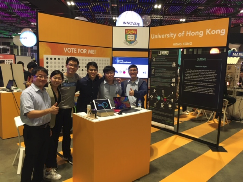 Another finalist team called Lumino. It aims to provide a cost-efficient one-stop solution to barrier-free movement for the visually impaired. It is a innovative device that represents both a guide dog and a white cane by providing smart-object identification, hazard identification, real time GPS navigation with additional markers and haptic feedback. The team members are the Computer Engineering undergraduate students Felix Wong, Desmond Wong, Alvin Yu and Jasmine Poon .