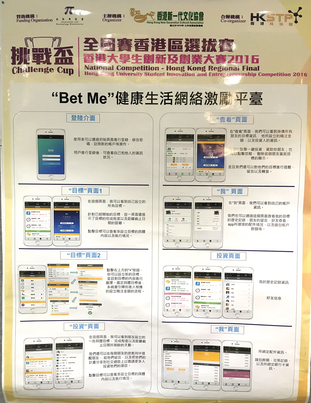 MSc Students Ms. Lin Rui Lamry (MSc EEE 2016) and Mr. Pan, Kangbom (MSc EEE 2016) had awarded the Second Prize in the National Challenge Cup 2016 – Innovation and Entrepreneurship (Hong Kong Section) for the M.Sc. project titled “Bet me”. It is a mobile apps with social network element that encourage students to accomplish their goal with their peer support. Ms. Lin and Mr. Pan will represent Hong Kong to participate in the National Challenge Cup in Chengdu in November and compete with over 300 other universities in China.